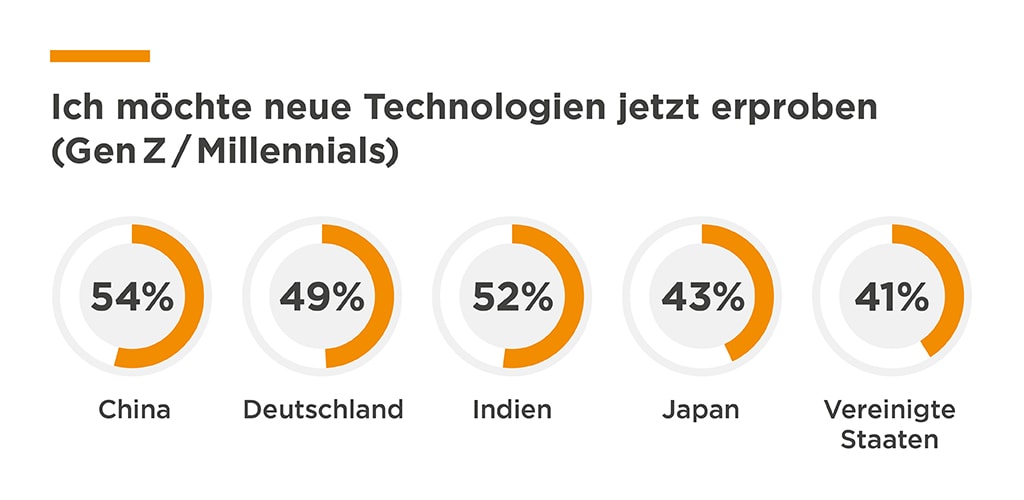 Diese höhere Innovationsgeschwindigkeit resultiert teilweise aus der wachsenden Routine im Einsatz neuer Technologien. Rund die Hälfte der Befragten (49 % der Führungskräfte, 45 % der Ingenieur:innen) strebt an, neue Technologien möglichst zeitnah zu erproben. Es überrascht nicht, dass insbesondere jüngere Führungskräfte besonders optimistisch sind: 56 % der Führungskräfte aus der Generation Z und den Millennials geben an, neue Technologien sofort erproben zu wollen – gegenüber 38 % der Führungskräfte der Generation X und älter. Länderübergreifend zeigen sich in China 54 % der Führungskräfte und Ingenieur:innen aus der Generation Z und den Millennials besonders offen für technologische Experimente – der höchste Wert im internationalen Vergleich.