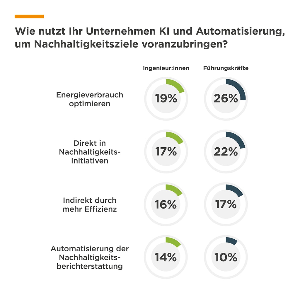 Über ihr Potenzial hinaus, Innovation und finanzielle Vorteile zu schaffen, kann KI auch eine wichtige Rolle bei den Nachhaltigkeitsbestrebungen von Unternehmen spielen. Tatsächlich geben nahezu alle Befragten (99 %) an, KI und Automatisierung in irgendeiner Form einzusetzen, um ihre Nachhaltigkeitsziele voranzubringen.