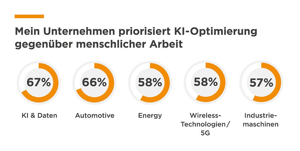 Obwohl viele Ingenieur:innen KI als Innovationspartner begrüßen, befürchten 59 %, dass der starke Fokus auf Effizienz und Optimierung in ihren Unternehmen menschliche Kreativität und von Menschen geführte Aufgaben nicht ausreichend schützt – gegenüber 47 % der Führungskräfte. Diese Bedenken sind besonders ausgeprägt in den Segmenten Automotive sowie Daten-/Cloud-Computing. Dort sind zwei Drittel der Befragten der Ansicht, dass ihre Unternehmen Optimierung stärker priorisieren als den Schutz von von Menschen geführten Aufgaben.