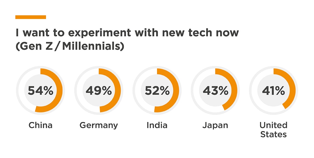 That increase in innovation speed comes in part from growing comfort with the use of emerging technologies. Nearly half of respondents (49% of executives, 45% of engineers) say they want to experiment with new technology as soon as possible. Unsurprisingly, younger executives are particularly bullish: 56% of Gen Z/Millennial executives say they want to experiment with new technology immediately, vs. 38% of Gen X and older executives. And across executives and engineers, 54% of Gen Z/Millennials in China are eager for technology experimentation, the highest share of any country surveyed.