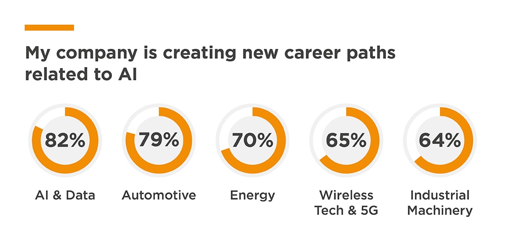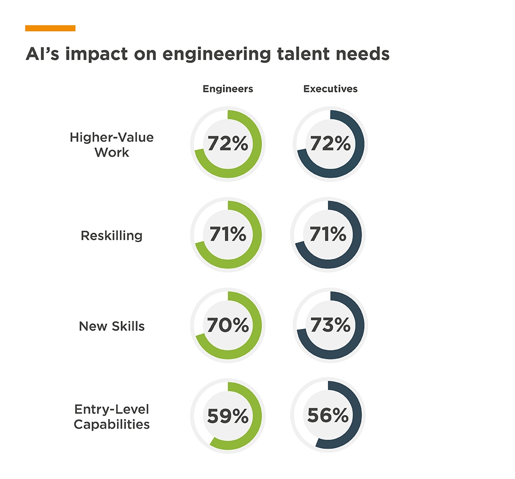Engineers and executives agree that AI is transforming the traditional engineering role by reducing the need for entry-level skills and the number of engineers needed to complete certain tasks. Rather than eliminating jobs, however, AI is expanding opportunities: 66% of respondents say that AI is creating new roles and career paths at their companies. That trend is strongest in the data/cloud computing and automotive industries.