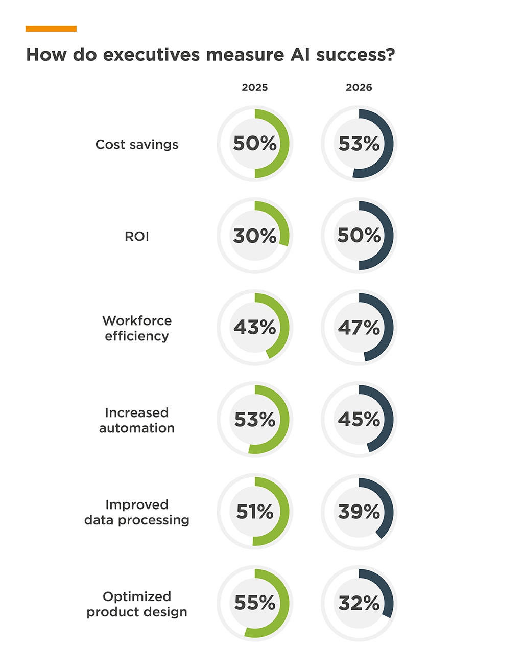 We also see a growing emphasis on financial metrics in the ways executives are evaluating their AI efforts. This year, cost savings, ROI and workforce efficiency improvements have surpassed last year’s top measures of AI success: optimized product designs, increased automation of manual tasks, and improved data processing and analysis.