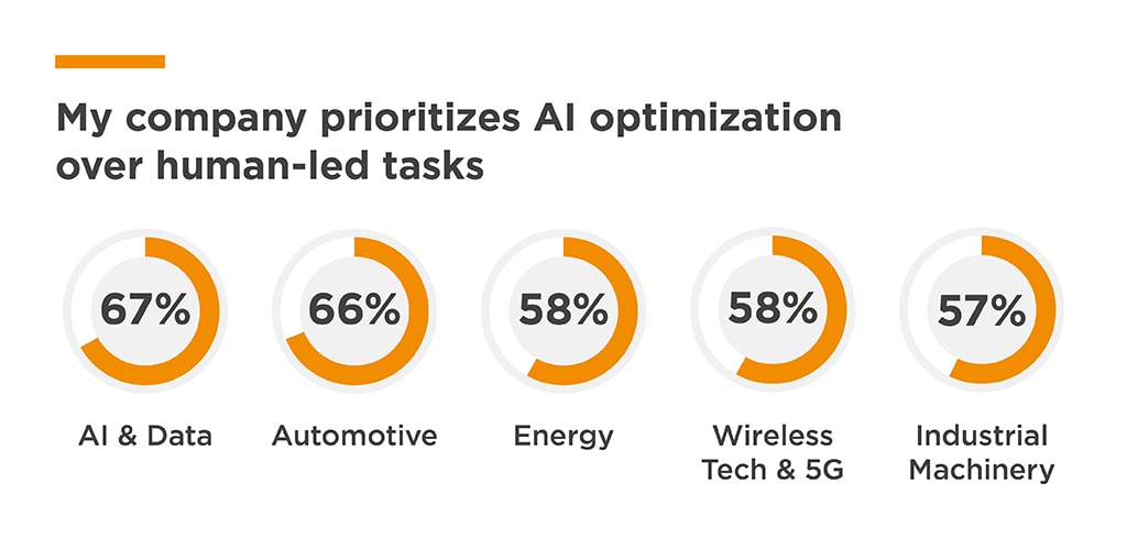 Despite embracing AI as an innovation partner, 59% of engineers worry that their companies’ emphasis on efficiency and optimization means they are not doing enough to protect human creativity and support human-led tasks, compared to 47% of executives. These concerns are particularly acute in the Automotive and Data/Cloud Computing segments, where two-thirds of all respondents believe that their companies are prioritizing optimization over protecting human-led tasks.