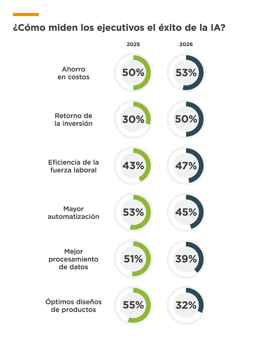 También se observa que los ejecutivos dan mayor énfasis a las métricas financieras al evaluar la iniciativas de la IA. Este año, el ahorro de costos, el retorno de la inversión y las mejoras en la eficiencia superan las principales métricas del año pasado: optimización del diseño de productos, mayor automatización de tareas manuales y mejor procesamiento y análisis de datos.
