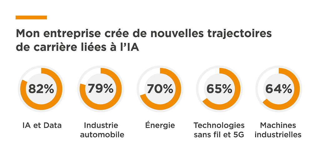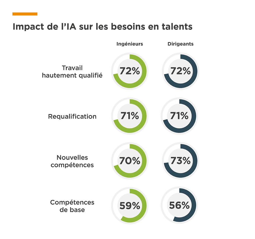Ingénieurs et dirigeants s’accordent pour dire que l’IA redéfinit le rôle traditionnel de l’ingénieur, en réduisant le besoin de compétences d’entrée de carrière ainsi que le nombre d’ingénieurs nécessaires pour réaliser certaines tâches. Cependant, plutôt que de supprimer des emplois, l'IA élargit les opportunités : 66 % des personnes interrogées affirment que l'IA crée de nouveaux rôles et de nouvelles perspectives de carrière dans leur entreprise. Cette tendance est particulièrement marquée dans les secteurs des données et du cloud computing, ainsi que dans l’industrie automobile.