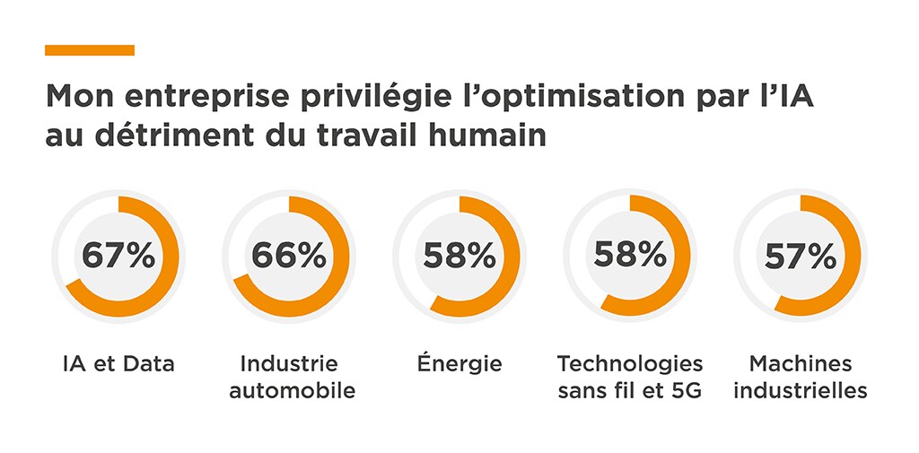 Bien qu’ils adoptent l’IA comme partenaire d’innovation, 59 % des ingénieurs s’inquiètent du fait que l’accent mis par leur entreprise sur l’efficacité et l’optimisation ne conduise à négliger la protection de la créativité humaine et le soutien aux activités pilotées par l’humain, contre 47 % des dirigeants. Ces préoccupations sont particulièrement marquées dans les secteurs Automobile et Data / Cloud Computing, où près des deux tiers des répondants estiment que leur entreprise privilégie l’optimisation au détriment de la protection du travail humain.