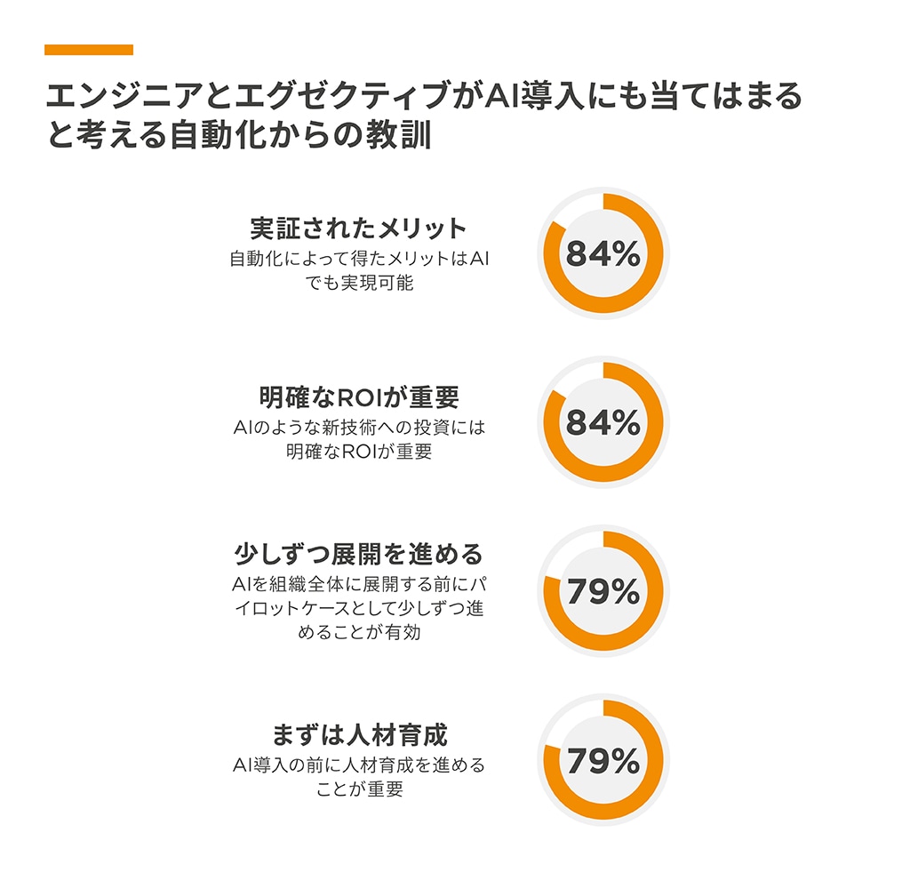 自動化で得たこのような教訓を生かすことで、企業はAI導入の取り組みからさらに大きな成果を得られる可能性があります。エンジニアの3分の2にあたる66%とエグゼクティブの58%は、AIは自動化よりも幅広い恩恵をもたらす可能性があると考えています。