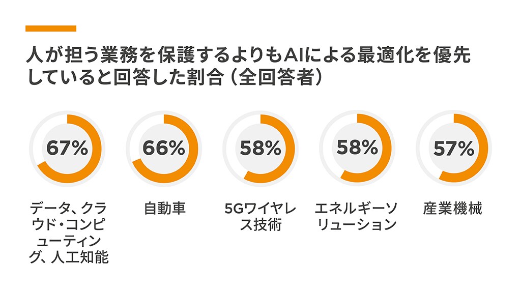 AIをイノベーションのパートナーとして受け入れる一方で、エンジニアの59%が、自社は効率性と最適化を重視するあまり、人間の創造性を守り、人が担う業務を支える取り組みが十分ではないのではないかと懸念しています(エグゼクティブは47%)。こうした懸念は、自動車分野とデータ、クラウド・コンピューティング分野で特に強く、回答者の約3分の2が、自社は「人間主導の業務を保護することよりも最適化を優先している」と考えています。