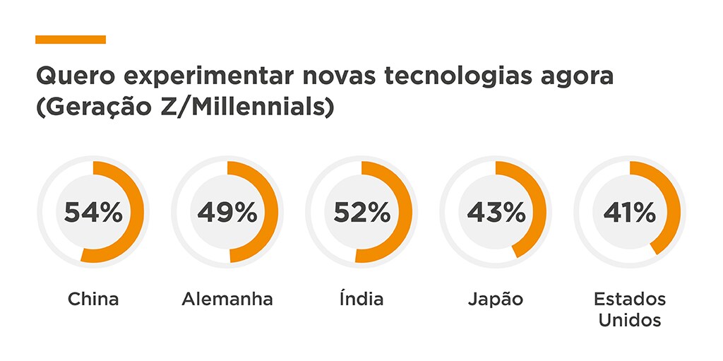 Esse aumento na velocidade da inovação se origina, em parte, da crescente familiarização com o uso de tecnologias emergentes. Quase metade dos entrevistados (49% dos executivos e 45% dos engenheiros) afirma que deseja experimentar novas tecnologias o mais rápido possível. Não é de surpreender que os executivos mais jovens estejam particularmente otimistas: 56% dos executivos da Geração Z/Millennial dizem que querem experimentar novas tecnologias imediatamente, em comparação com 38% dos executivos da Geração X e mais velhos. E entre os executivos e engenheiros, 54% da Geração Z/Millennials na China estão ansiosos por experiências tecnológicas, a maior parcela de qualquer país pesquisado.