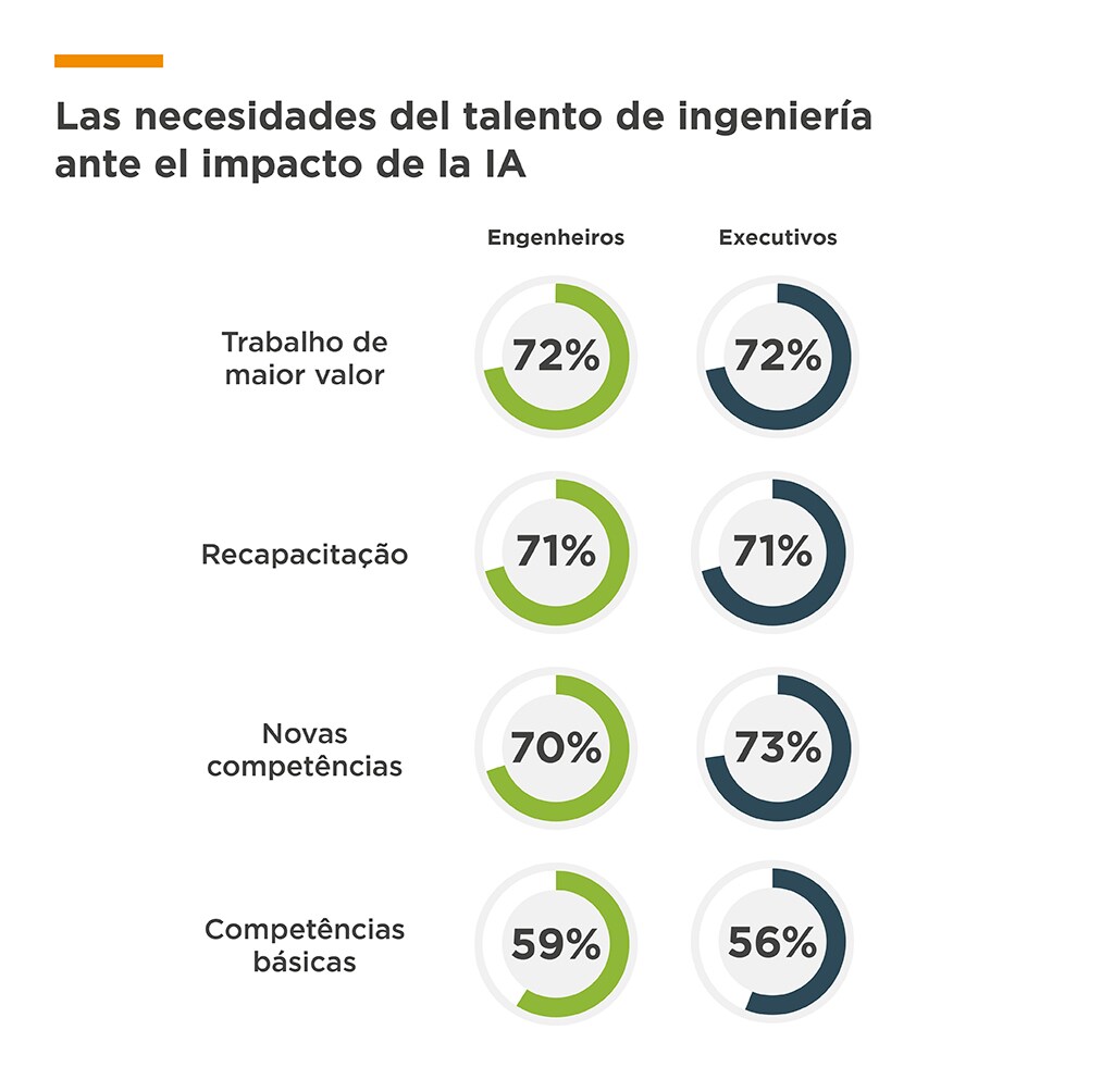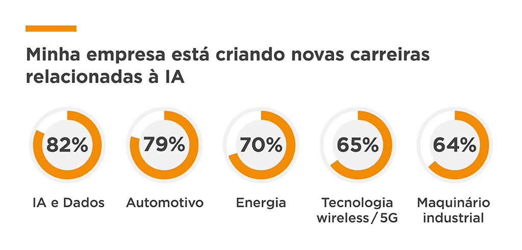 A IA está transformando funções tradicionais em engenharia ao reduzir a demanda por competências de nível básico e diminuir o número de engenheiros necessários para realizar determinadas tarefas. No entanto, em vez de eliminar empregos, a IA está expandindo oportunidades: 66% dos entrevistados afirmam que a IA está criando novas funções e planos de carreira em suas empresas. Essa tendência é mais forte nos setores de dados, computação em nuvem, IA e automotivo.