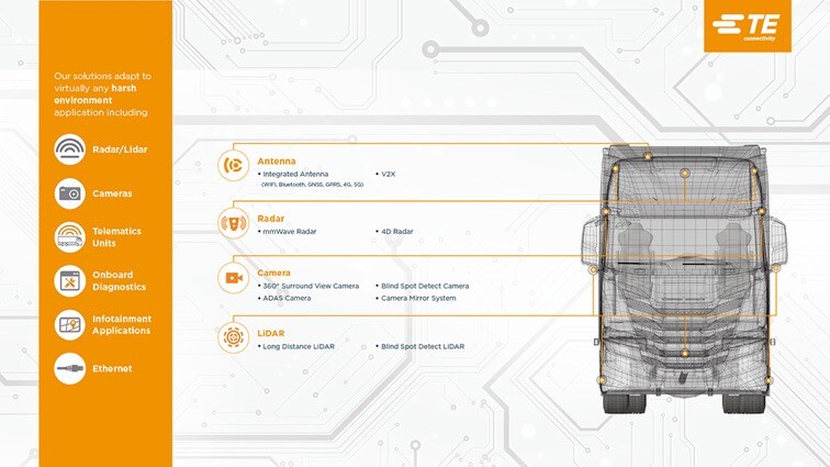 Com nossas soluções para caminhões, proporcionamos a você transmissão de dados em alta velocidade, muita largura de banda e baixa latência para dar suporte a veículos conectados, avanços na segurança e aplicações de direção autônoma. Tudo isso vem em um pacote mecânico robusto, indicado para os ambientes mais adversos.